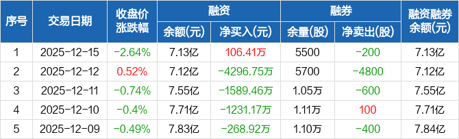 融资方面,当日融资买入1381.69万元,融资偿还1275.28万元,融资净买入106.41万元。融券方面,融券卖出0股,融券偿还200股,融券余量5500股,融券余额23.69万元。融资融券余额合计7.13亿元。