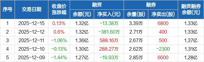 飞南资源:融资净偿还13.38万元,融资余额1.32亿元(12-15)