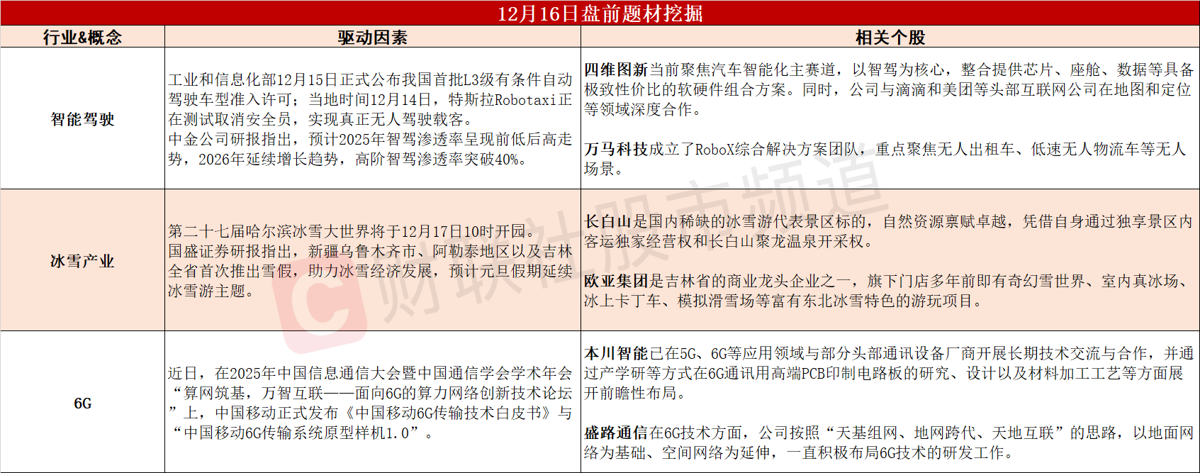 ①我国公布首批L3级自动驾驶车型准入许可,高阶智驾渗透率或持续提升。②哈尔滨冰雪大世界将于明日开园,冰雪经济有望成为扩内需重要抓手。③中国移动发布6G传输系统原型样机,通信板块迎产业升级机遇。