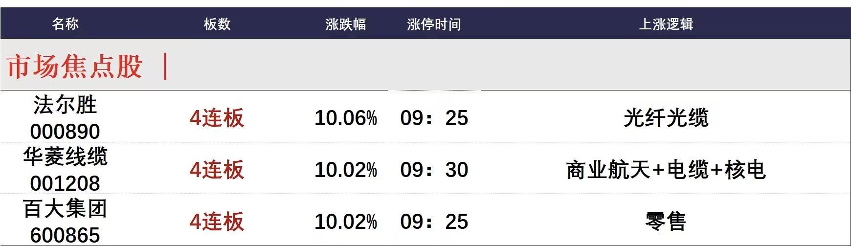 今日午盘全市场共30股涨停,连板股总数11只,15股封板未遂,封板率为67%(不含ST股、退市股)。焦点股方面,光纤光缆概念股法尔胜4连板,零售板块百大集团4连板,商业航天概念股华菱线缆4连板。