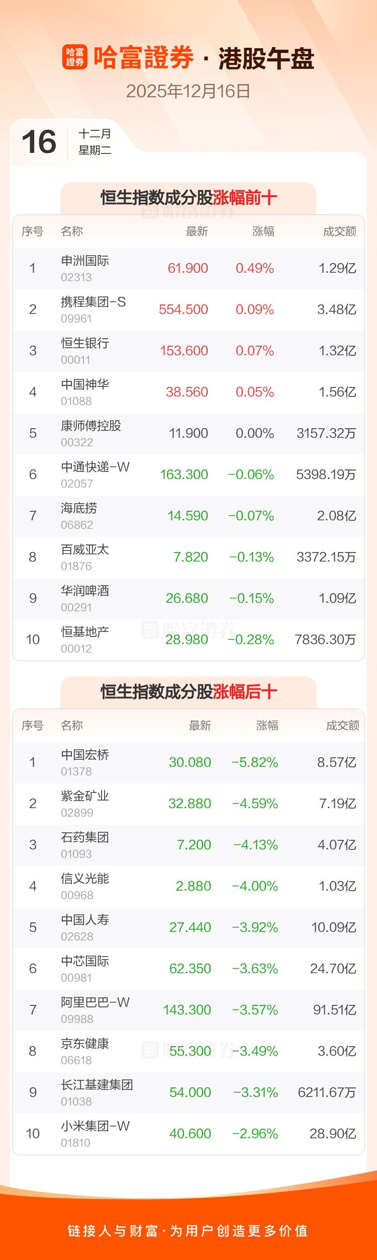 港股12月16日午盘走低,恒生指数收报25139.16点,跌489.72点,跌幅1.91%;恒生科技指数收报5365.9点,跌132.52点,跌幅2.41%。恒生指数成分股中申洲国际、携程集团-S、恒生银行涨幅居前,中国宏桥、紫金矿业、石药集团跌幅靠前。恒生科技指数成分股中携程集团-S、金蝶国际、同程旅行涨幅居前,商汤-W、小鹏汽车-W、中芯国际跌幅靠前。