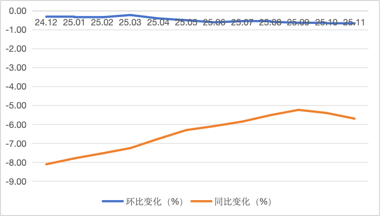 根据简单算术平均计算,11月份全国70个城市二手住宅价格指数环比跌幅为0.7%,同比跌幅为5.7%。二手房依然处于深度的调整过程中,其环比指标和10月份的表现相似。
