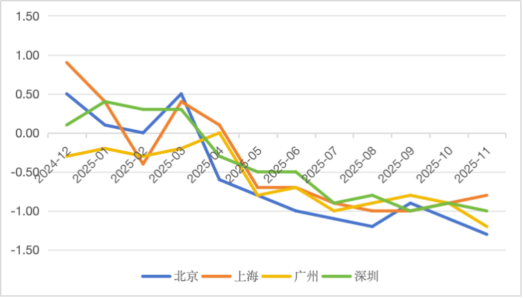 根据简单算术平均计算,11月份一二三线城市的房价指数环比变化数据看,分别下跌1.1%、0.7%和0.6%。从当前二手房价格指数环比指标来看,一二线城市跌幅有所扩大,三线城市则有所收窄。