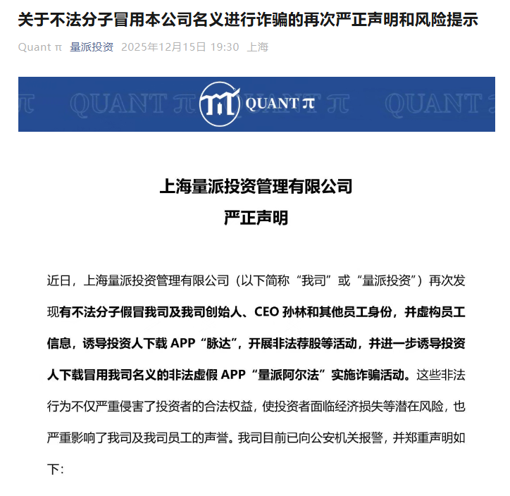 12月15日晚,量派投资严正声明,相关非法行为不仅严重侵害了投资者的合法权益,使投资者面临经济损失等潜在风险,也严重影响了公司及公司员工的声誉。目前,量派投资已向公安机关报警。