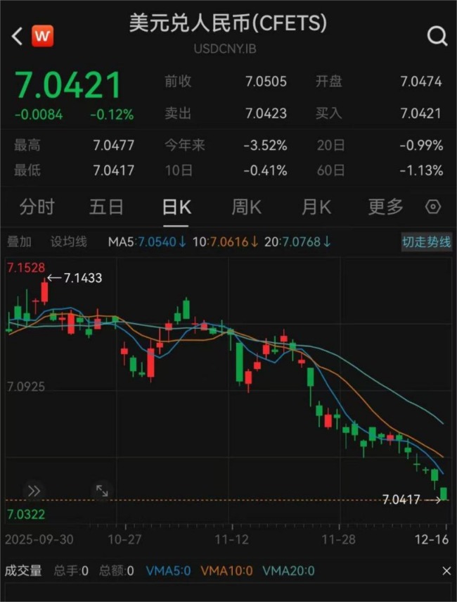 在岸人民币对美元汇率盘中最高升至7.0417,创下2024年10月8日以来新高,截至发稿,报7.0421。