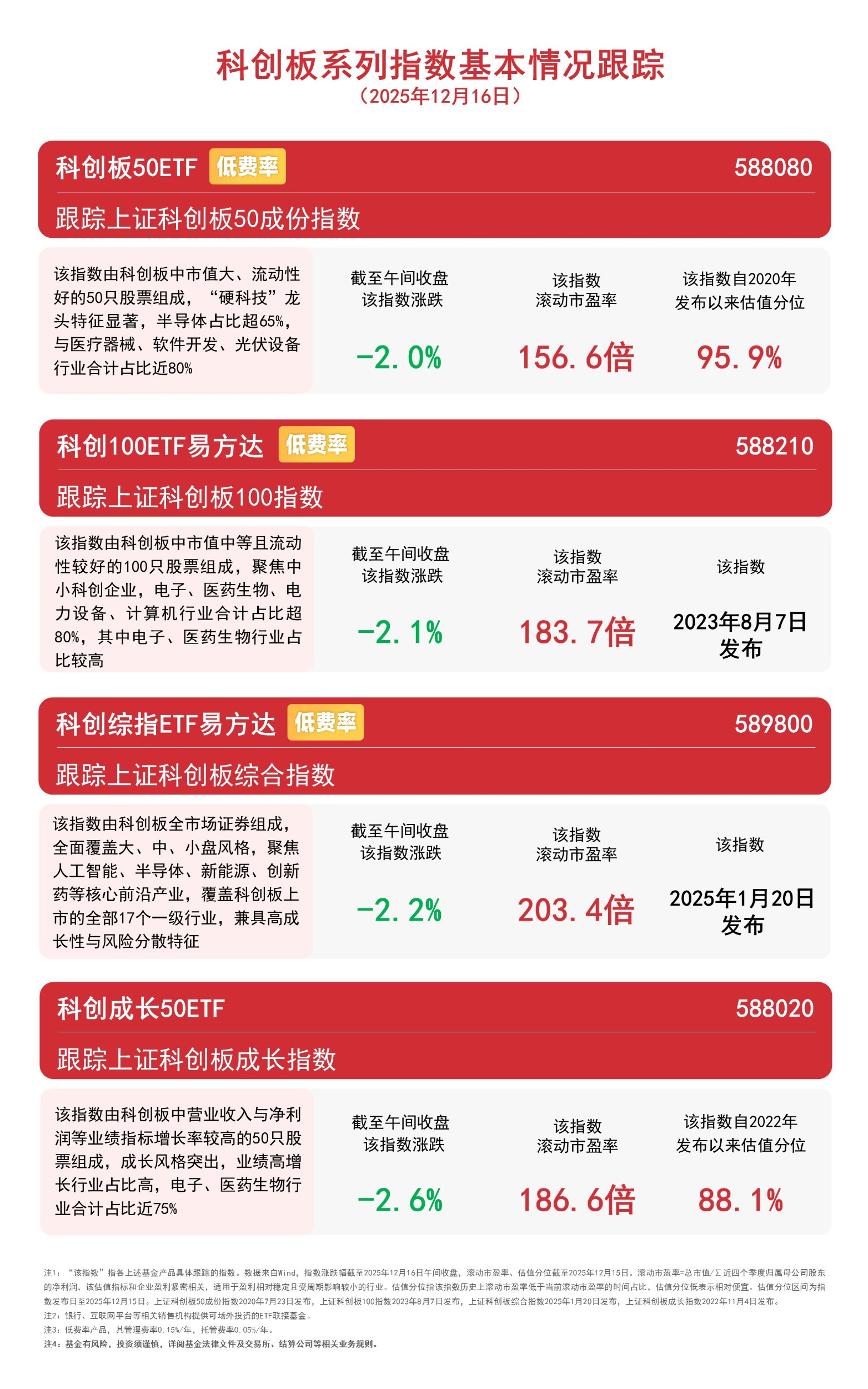 截至午间收盘,科创板50指数下跌2%,科创100指数下跌2.1%,科创综指下跌2.2%,科创成长指数下跌2.6%。Wind数据显示,科创板50ETF(588080)12月以来合计“吸金”超10亿元。
