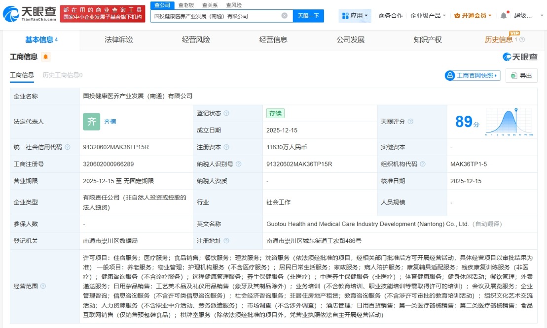 每经AI快讯,天眼查App显示,近日,国投健康医养产业发展(南通)有限公司成立,法定代表人为齐楠,注册资本约1.16亿元人民币,经营范围包括住宿服务、医疗服务、食品销售、餐饮服务等。股东信息显示,该公司由国投健康产业投资有限公司全资持股。