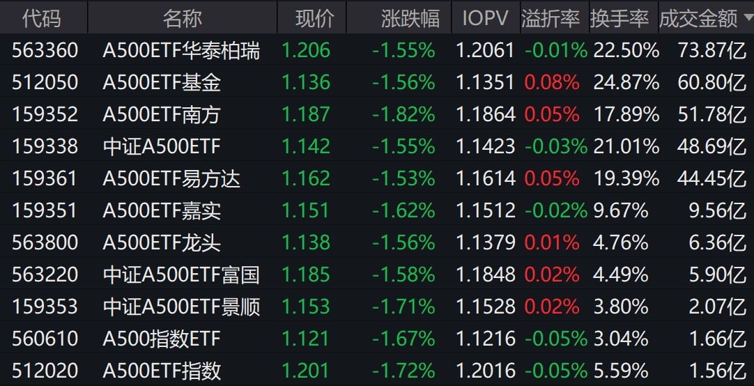 市场早盘震荡调整,中证A500指数下跌1.65%,3只中证A500相关ETF成交额超51亿元