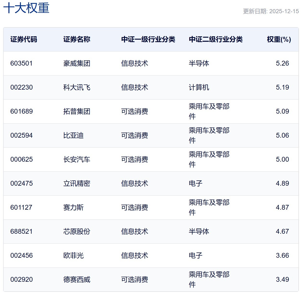 中证智能汽车主题指数前十大权重股