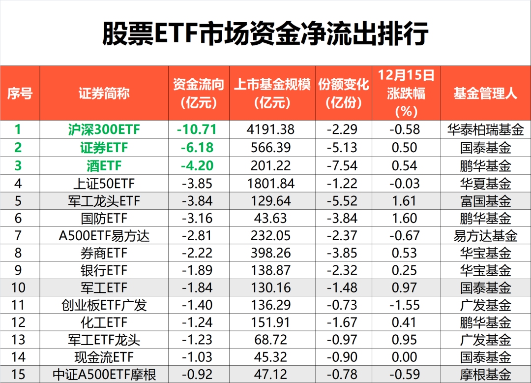 资金流出方面,昨日沪深300指数净流出居前,达12.21亿元,跟踪该指数的沪深300ETF昨日净流出10.71亿元,位居全市场首位。另外,上证50ETF、A500ETF易方达等产品,在宽基ETF中净流出居前。