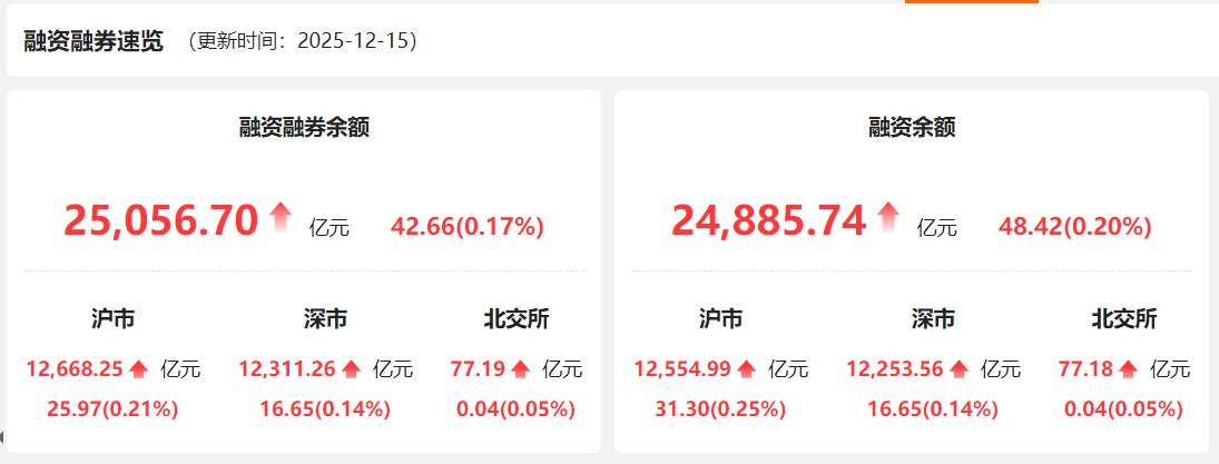 上证报中国证券网讯(卢伊记者徐蔚)12月15日,A股两融余额为25056.70亿元,较上一交易日增加42.66亿元,占A股流通市值比例为2.62%。当日两融交易额为1778.72亿元,较上一交易日减少175.63亿元,占A股成交额的9.89%。