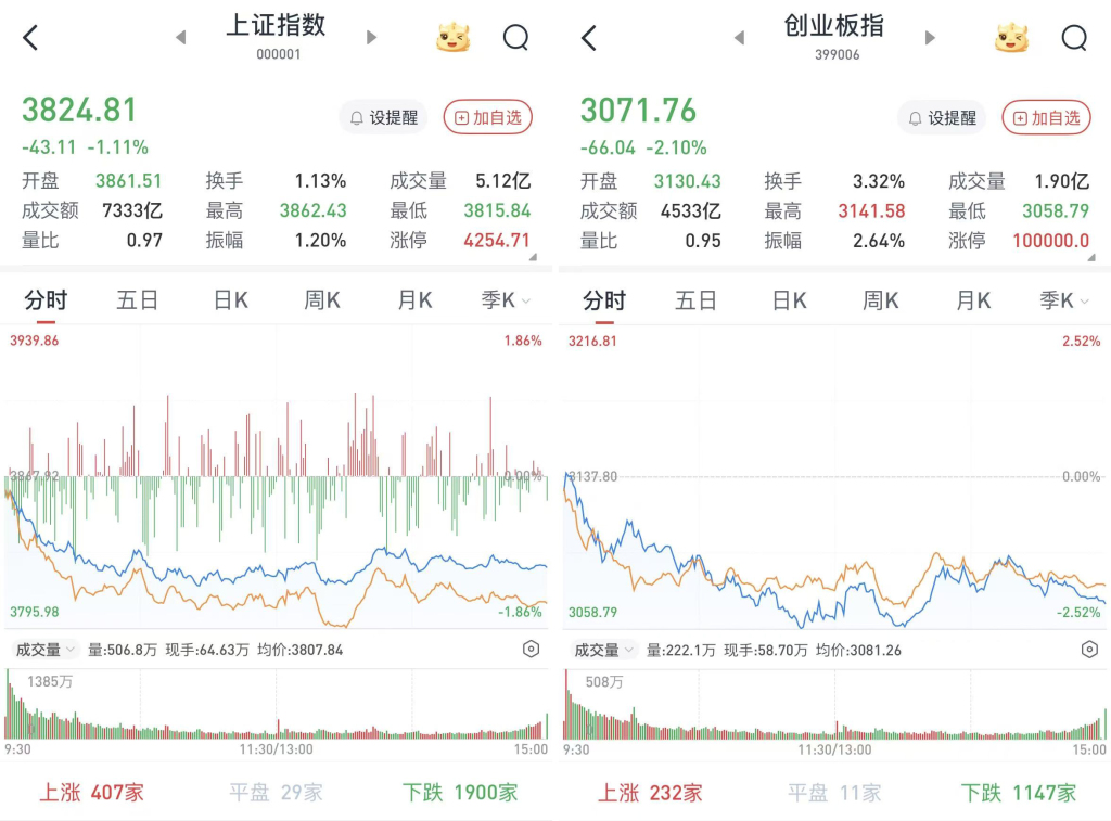 至收盘,上证综指跌1.11%,报3824.81点;科创50指数跌1.94%,报1293.38点;深证成指跌1.51%,报12914.67点;创业板指跌2.1%,报3071.76点。