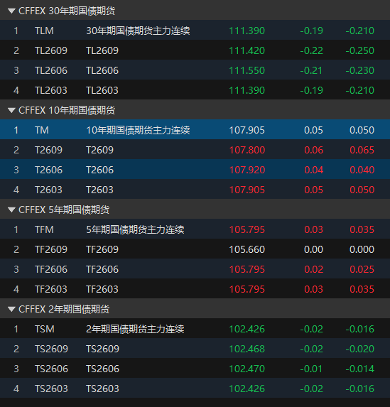 12月16日,国债期货收盘表现分化,30年期主力合约跌0.19%,报111.390元,10年期主力合约涨0.05%,报107.905元,5年期主力合约涨0.03%,报105.795元,2年期主力合约跌0.02%,报102.426元。