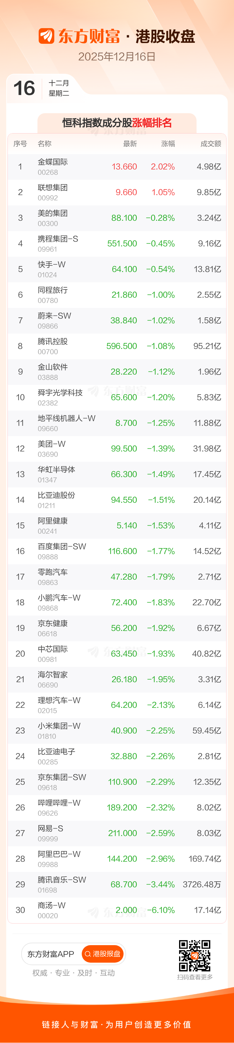 12月16日港股收盘:恒指跌1.54% 恒生科技指数跌1.74%