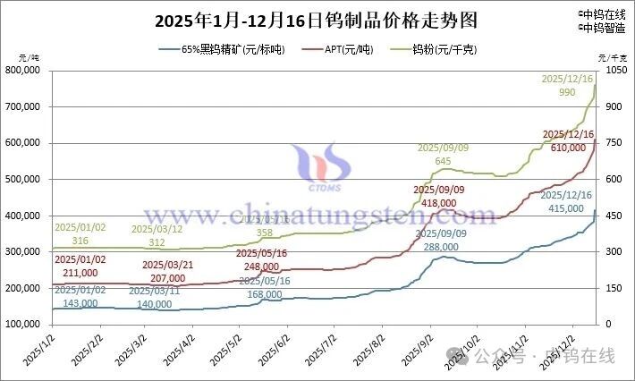 12月16日,据中钨在线消息,钨市场呈现加速上行态势,单日涨幅高达4-7%。截至发稿,钨精矿价格突破40万大关,APT价格突破60万大关,钨粉价格逼近千元大关。业内人士指出,今年以来钨价涨势已远超实体消费支撑,更多是由投机需求主导。随着年末资金博弈属性增强,市场不确定性进一步放大,建议参与者理性审慎操作,防范投机波动。截至发稿,65%黑钨精矿价格报41.5万元/标吨,较年初涨190.2%。