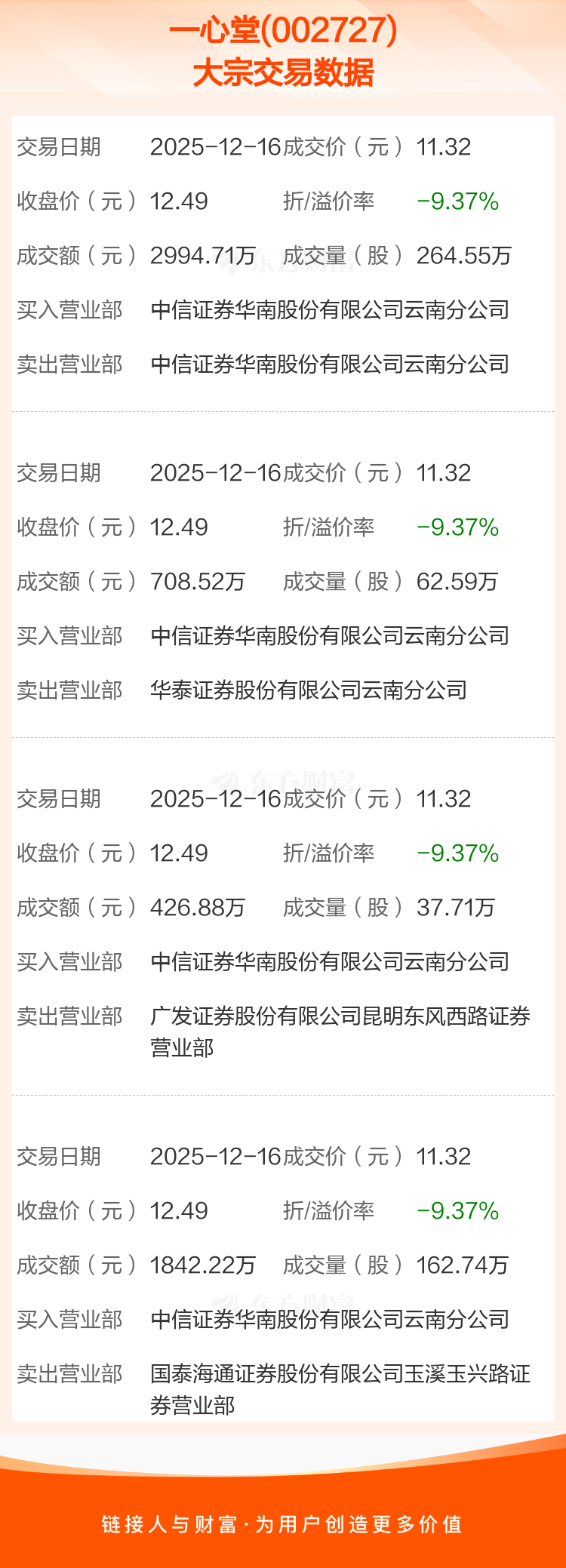 大宗交易:一心堂成交5972.33万元,折价9.37%(12-16)