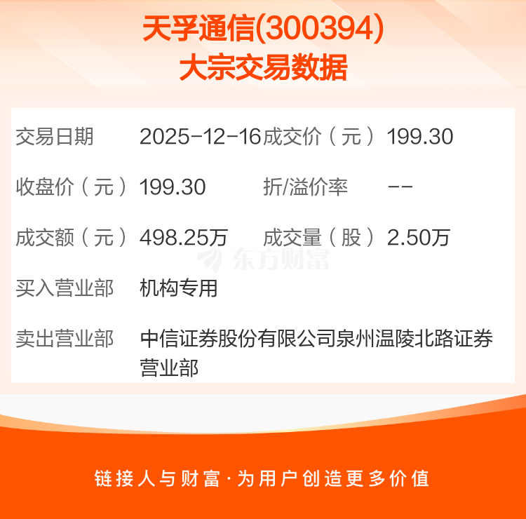 2025年12月16日,天孚通信发生1笔大宗交易,共成交2.50万股,成交金额498.25万元。