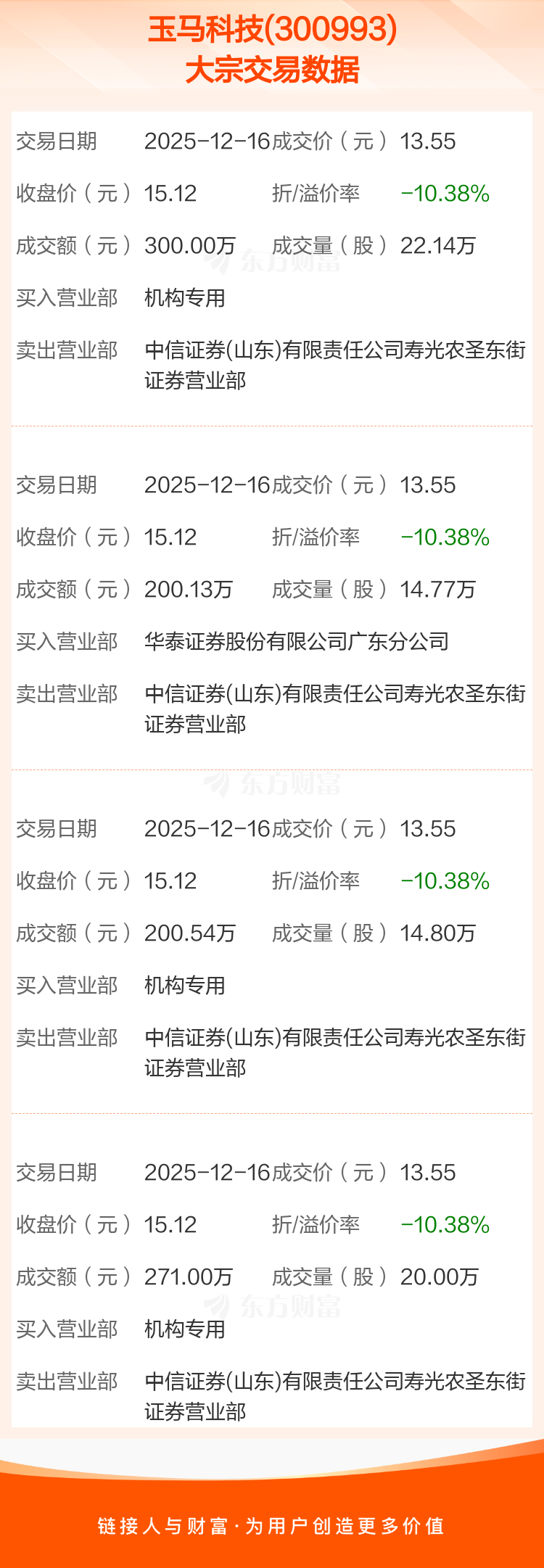 2025年12月16日,玉马科技发生4笔大宗交易,共成交71.71万股,成交金额971.67万元,占其流通市值比例为0.27%
