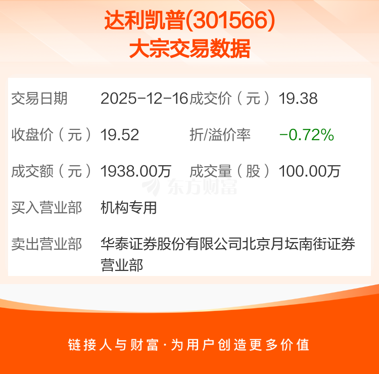 2025年12月16日,达利凯普发生1笔大宗交易,共成交100.00万股,成交金额1938.00万元,占其流通市值比例为0.48%。
