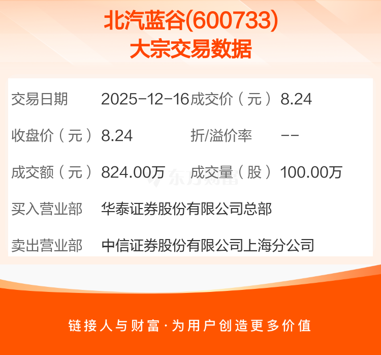 2025年12月16日,北汽蓝谷发生1笔大宗交易,共成交100.00万股,成交金额824.00万元,占其流通市值比例为0.02%。