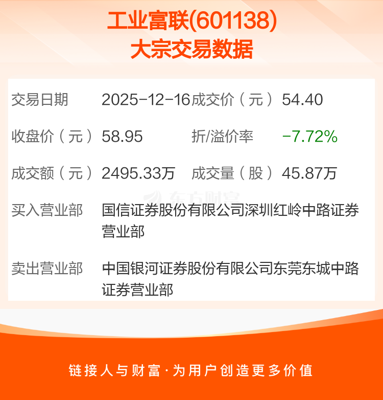 2025年12月16日,工业富联发生1笔大宗交易,共成交45.87万股,成交金额2495.33万元。
