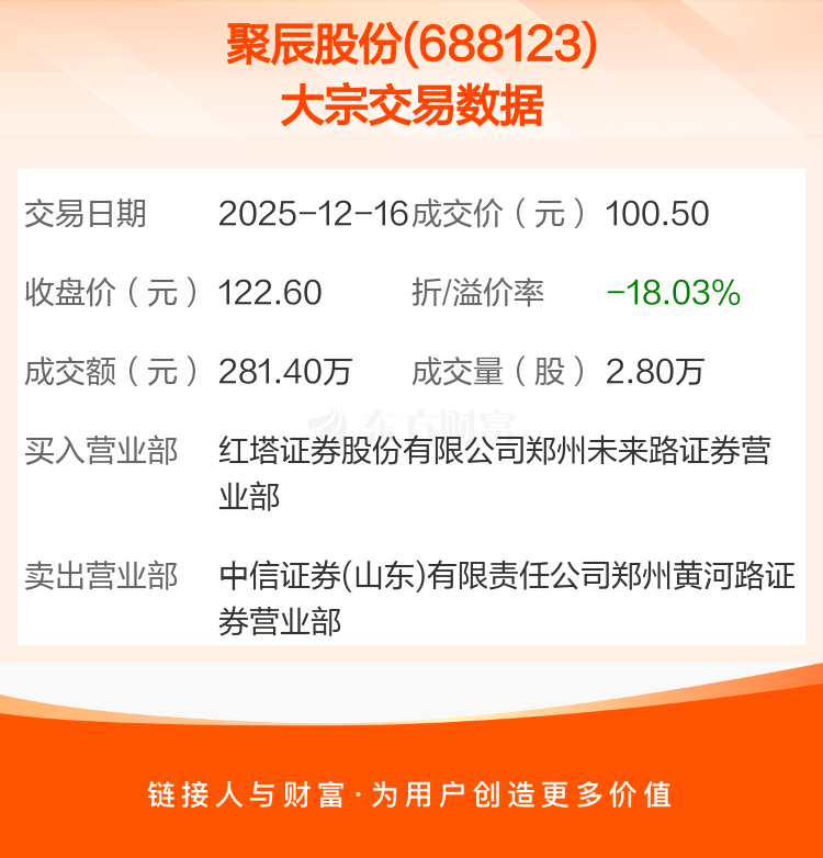 该笔大宗交易成交均价100.50元,较该股当日收盘价122.60元折价18.03%。
