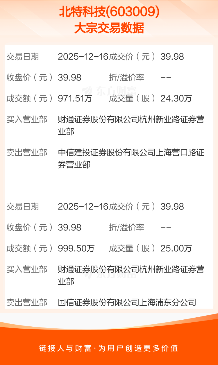 2025年12月16日,北特科技发生2笔大宗交易,共成交49.30万股,成交金额1971.01万元,占其流通市值比例为0.15%。