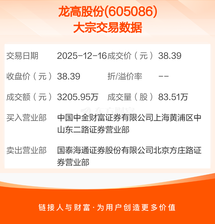 2025年12月16日,龙高股份发生1笔大宗交易,共成交83.51万股,成交金额3205.95万元,占其流通市值比例为0.47%。