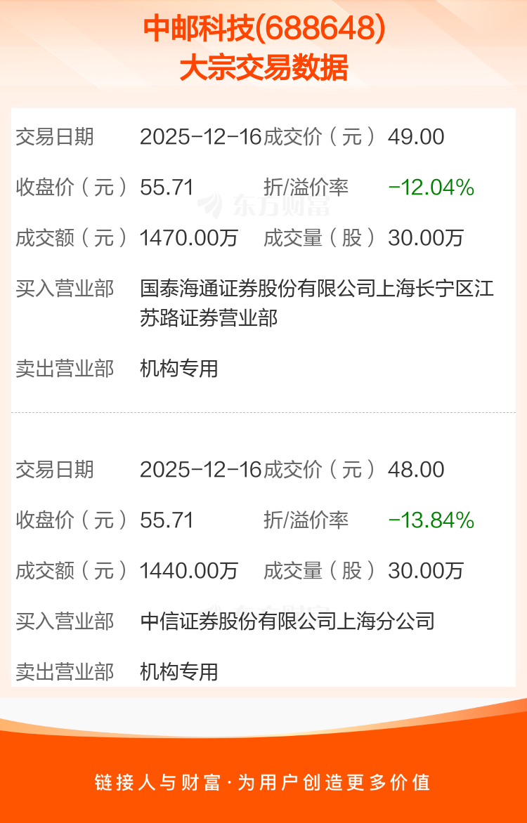 2025年12月16日,中邮科技发生2笔大宗交易,共成交60.00万股,成交金额2910.00万元,占其流通市值比例为0.75%。