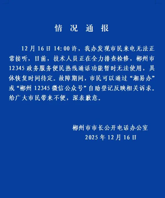 郴州市市长公开电话办公室通报,12月16日14:00许,该办发现市民来电无法正常接听,目前,技术人员正在全力排查检修,郴州市12345政务服务便民热线通话功能暂时无法使用,具体恢复时间待定。故障期间,市民可以通过“湘易办”或“郴州12345微信公众号”自助登记反映相关诉求。给广大市民带来不便,深表歉意。