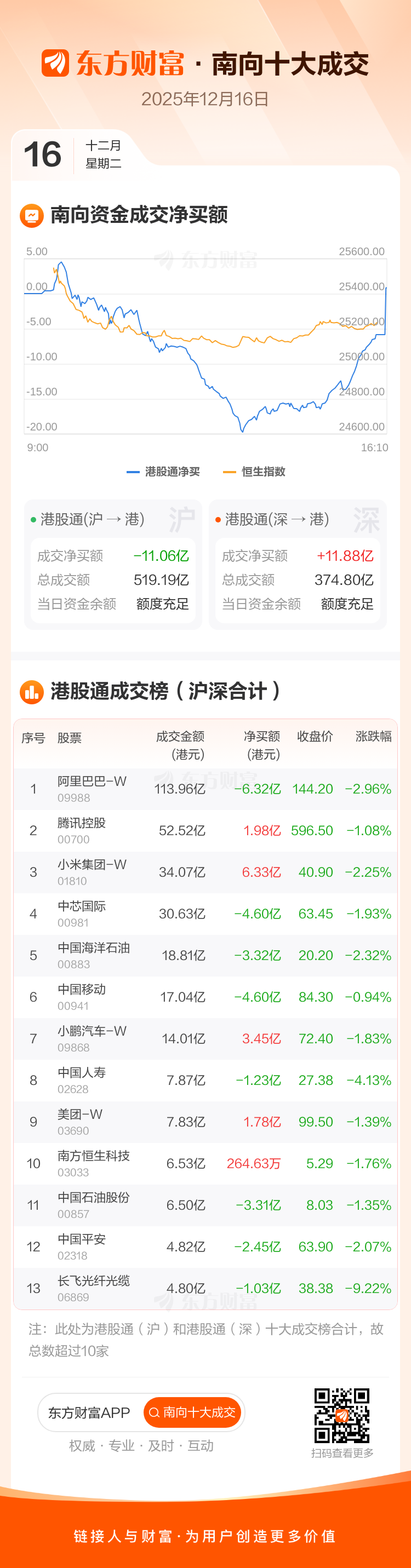 恒生指数12月16日跌1.54%,收报25235.41点。南向资金今日净买入港股8202.90万港元。南向资金今日成交额893.99亿港元,港股大市成交2015.28亿港元。