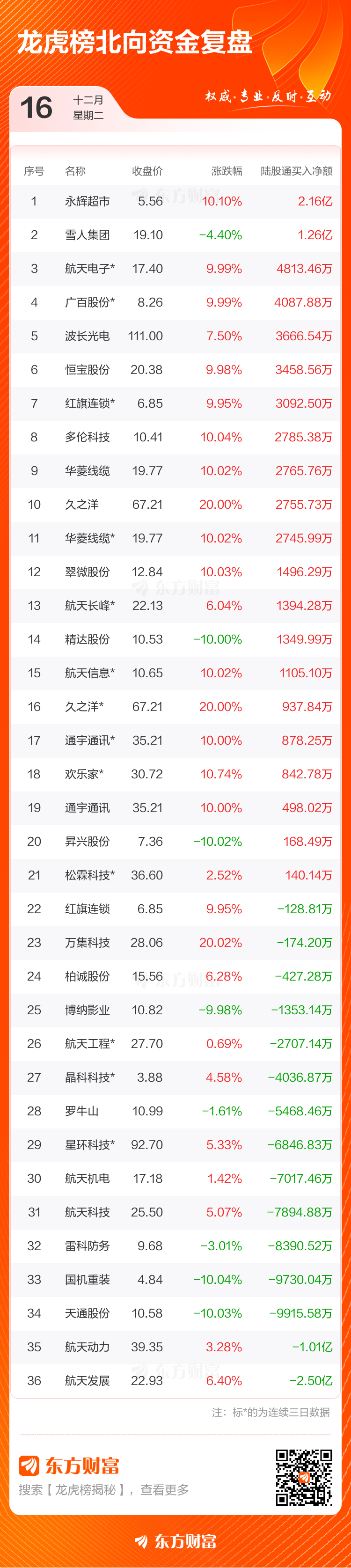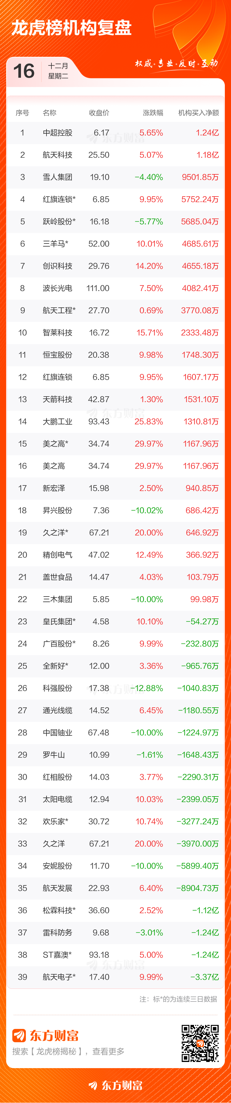 12月16日龙虎榜复盘:“陈小群”5.71亿元净买入航天电子