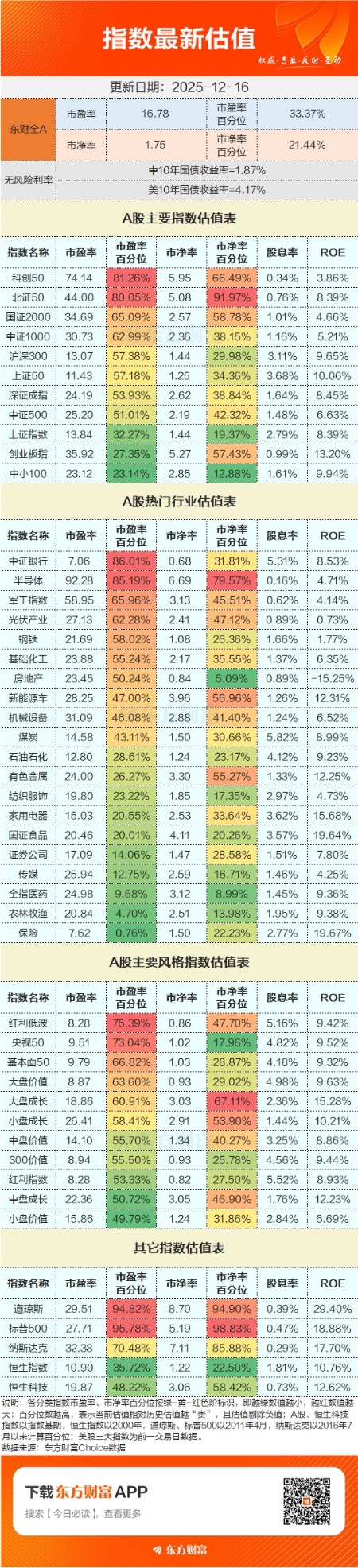 截至12月16日收盘,东方财富Choice数据显示,东财全A市盈率为16.78倍,市盈率百分位为33.37%;市净率为1.75倍,市净率百分位为21.44%。