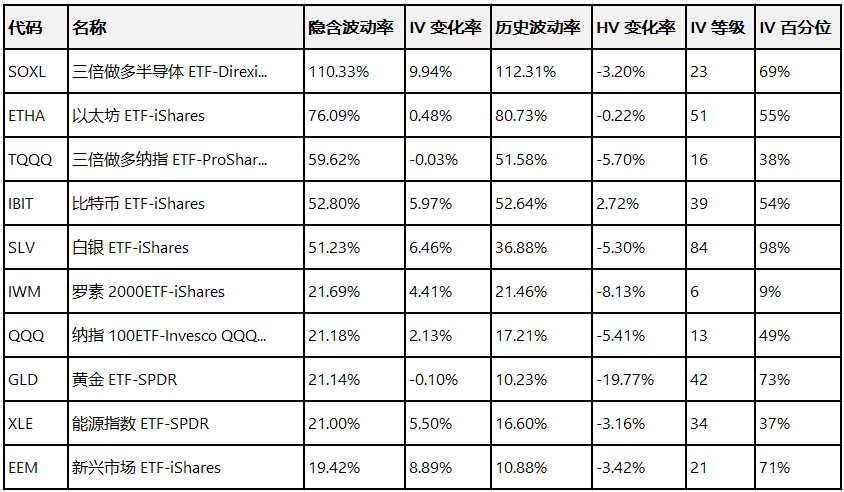 美股ETF引申波幅排行榜前十(标的要求:市值>100亿美元)