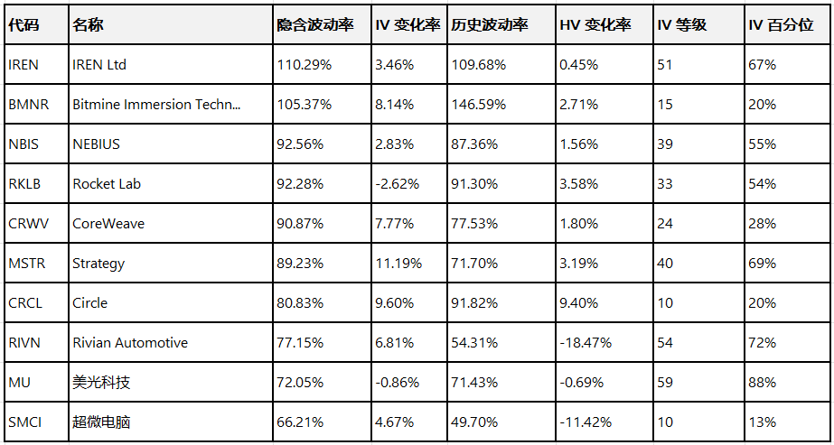 美股期权波动率排行榜前十(标的市值>100亿美元,且期权成交量>10万张)