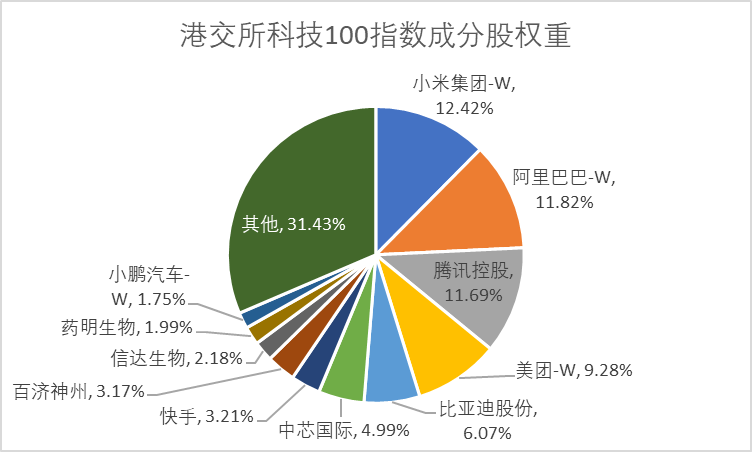 从成分结构看,港交所科技100指数呈现出明显的头部集中与尾部分散的特征。