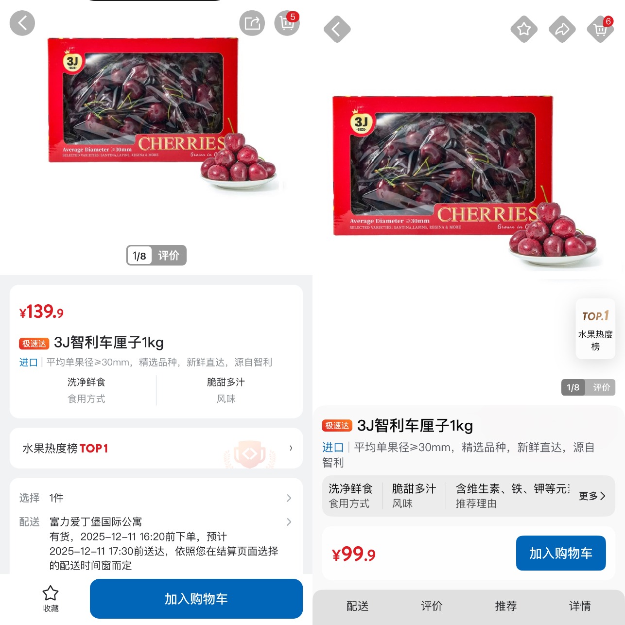 叮咚买菜、朴朴超市多款车厘子产品价格也在下探。叮咚买菜方面,12月15日价格较12月12日环比下降,三款车厘子降幅在4%~7.8%,3J规格1kg礼盒装、2.5kg装价格分别从129元、239元降至119元、229元。
