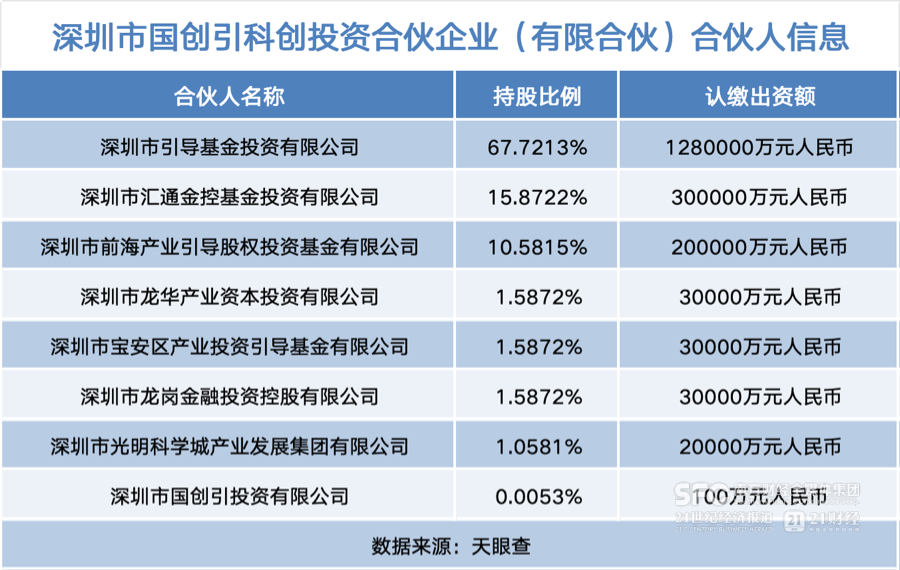 天眼查数据显示,其中,深圳市引导基金出资比例最高(67.7213%),认缴出资128亿元,且通过深圳市国创引投资有限公司间接持股0.0053%。