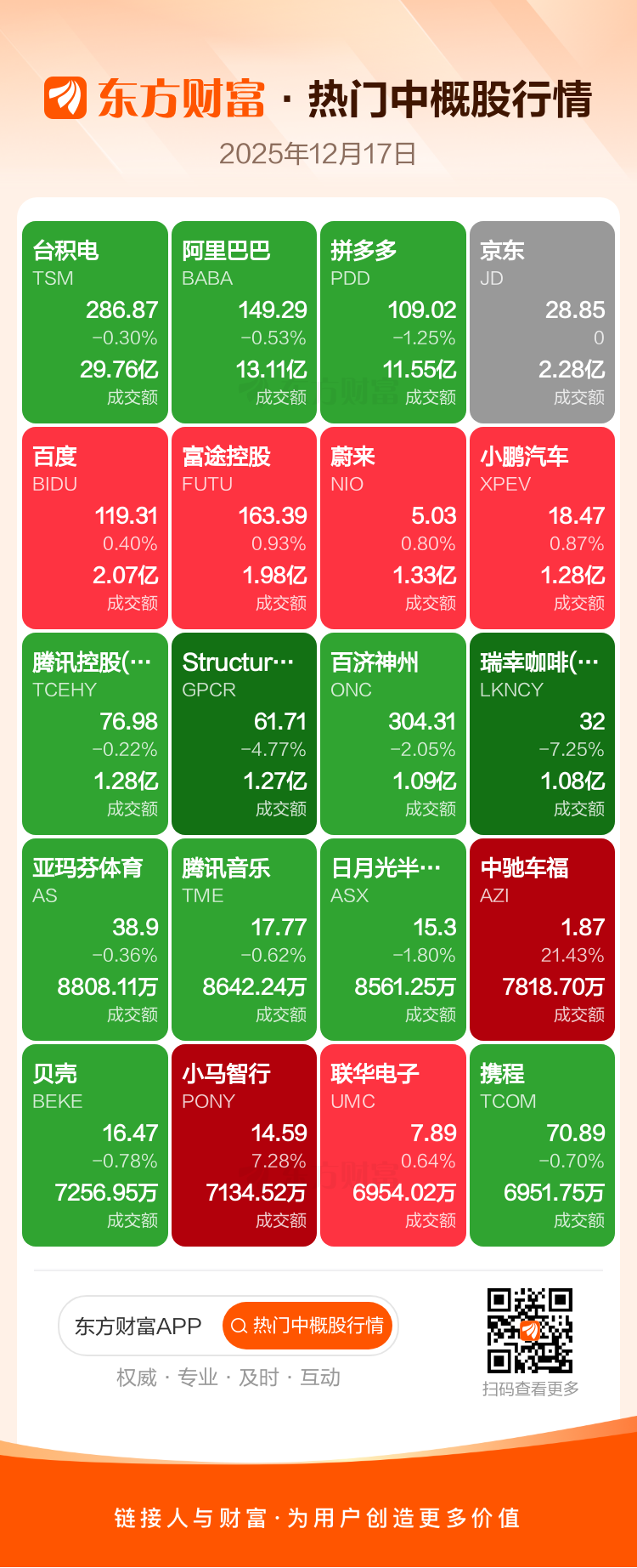 台积电跌0.30%,阿里巴巴跌0.53%,拼多多跌1.25%,京东平收,百度涨0.40%,富途控股涨0.93%,蔚来涨0.80%,小鹏汽车涨0.87%,腾讯控股(ADR)跌0.22%,Structure Therapeutics Inc ADR跌4.77%。