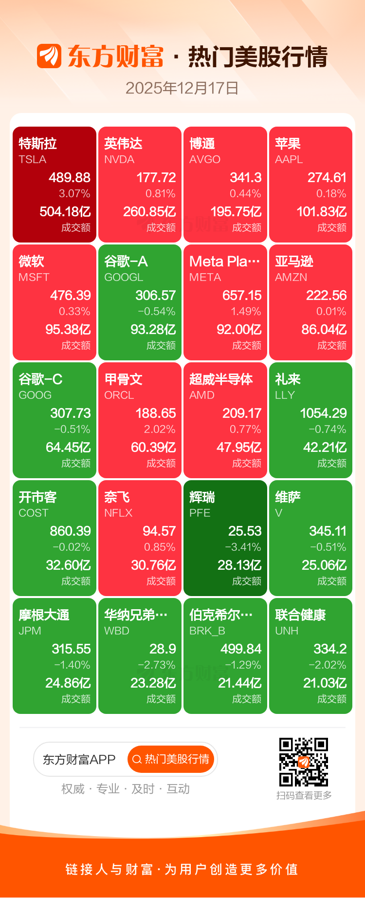 特斯拉涨3.07%,英伟达涨0.81%,博通涨0.44%,苹果涨0.18%,微软涨0.33%,谷歌-A跌0.54%,Meta Platforms Inc-A涨1.49%,亚马逊涨0.01%,谷歌-C跌0.51%,甲骨文涨2.02%。