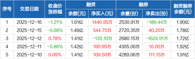 融资方面,当日融资买入2532.89万元,融资偿还1091.94万元,融资净买入1440.95万元。融券方面,融券卖出35.51万份,融券偿还224.95万份,融券余量2530.91万份,融券余额2900.42万元。融资融券余额合计1.9亿元。