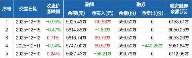 融资方面,当日融资买入424.57万元,融资偿还313.98万元,融资净买入110.58万元。融券方面,融券卖出0份,融券偿还0份,融券余量556.5万份,融券余额233.17万元。融资融券余额合计6158.61万元。