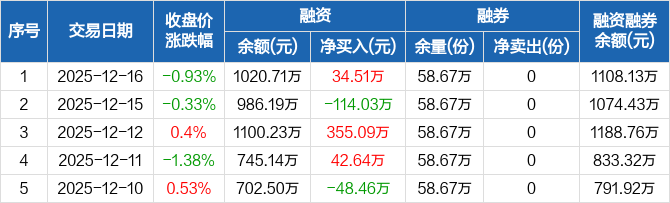 融资方面,当日融资买入277.95万元,融资偿还243.44万元,融资净买入34.51万元。融券方面,融券卖出0份,融券偿还0份,融券余量58.67万份,融券余额87.42万元。融资融券余额合计1108.13万元。