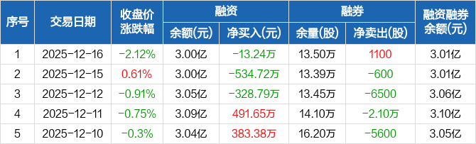 融资方面,当日融资买入531.03万元,融资偿还544.28万元,融资净偿还13.24万元,连续3日净偿还累计876.75万元。融券方面,融券卖出1600股,融券偿还500股,融券余量13.5万股,融券余额87.21万元。融资融券余额合计3.01亿元。