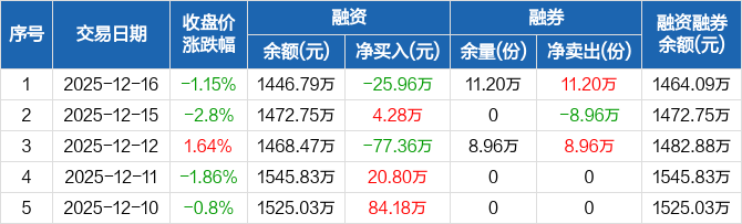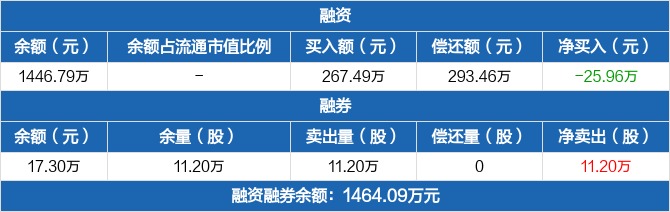 融资方面,当日融资买入267.49万元,融资偿还293.46万元,融资净偿还25.96万元。融券方面,融券卖出11.2万份,融券偿还0份,融券余量11.2万份,融券余额17.3万元。融资融券余额合计1464.09万元。