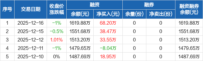 融资方面,当日融资买入200.67万元,融资偿还132.47万元,融资净买入68.2万元,连续3日净买入累计140.23万元。融券方面,融券卖出0份,融券偿还0份,融券余量0份,融券余额0元。融资融券余额合计1619.88万元。