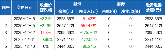 融资方面,当日融资买入655.1万元,融资偿还473.67万元,融资净买入181.43万元。融券方面,融券卖出0份,融券偿还0份,融券余量0份,融券余额0元。融资融券余额合计2828.55万元。