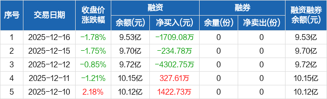 融资方面,当日融资买入1.52亿元,融资偿还1.7亿元,融资净偿还1709.08万元,连续3日净偿还累计6246.61万元。融券方面,融券卖出0份,融券偿还0份,融券余量0份,融券余额0元。融资融券余额合计9.53亿元。