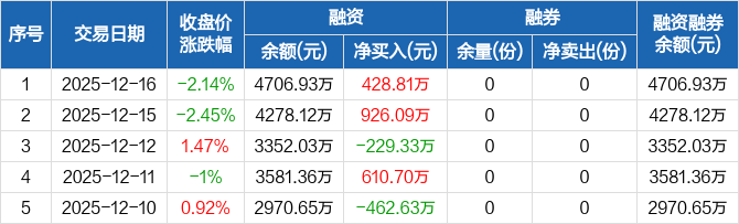 融资方面,当日融资买入3606.63万元,融资偿还3177.82万元,融资净买入428.81万元。融券方面,融券卖出0份,融券偿还0份,融券余量0份,融券余额0元。融资融券余额合计4706.93万元。