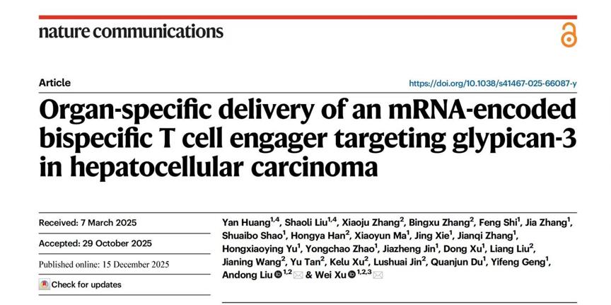 12月15日,国际期刊《自然·通讯》发表了剂泰科技MTS-105在肝细胞癌治疗领域最新研究成果。研究显示,mRNA编码的双特异性抗体T细胞衔接器在肝细胞癌小鼠模型中实现了肿瘤细胞完全清除并诱导长期T细胞免疫记忆,有望成为全球首款mRNA编码T细胞连接器(TCE)实体瘤疗法。